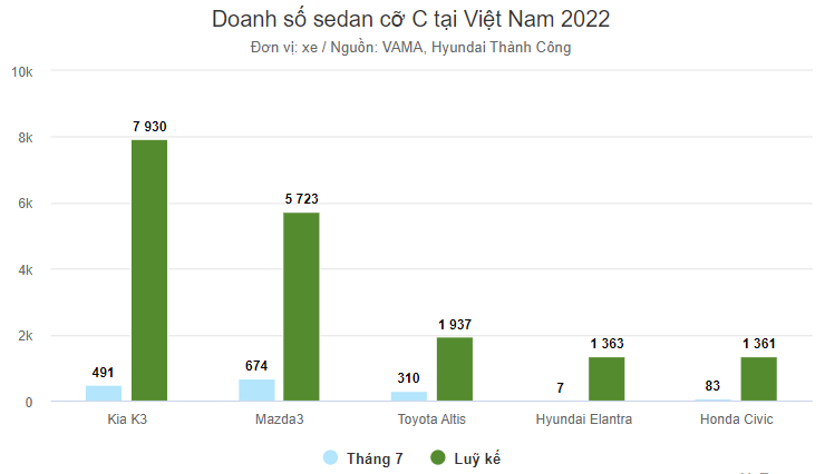 Sau 7 tháng đầu 2022, Kia K3 bán 7.930 xe, tiếp tục là mẫu xe cỡ C gầm thấp được người Việt ưa chuộng nhất. K3 và Mazda3 cùng được lắp ráp và phân phối bởi Trường Hải (Thaco). Hai mẫu xe này bán tổng cộng 13.653 xe, tương đương thị phần 74,5%, giúp Thaco thâu tóm phân khúc này.